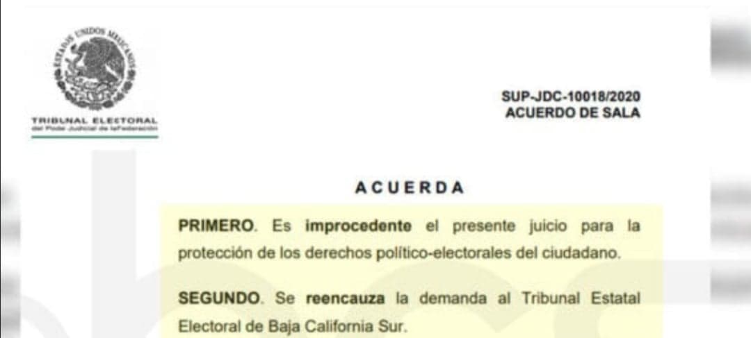 “Es improcedente el presente juicio para la protección de los derechos político-electorales del ciudadano”, acordó la Sala del Tribunal Electoral del Poder Judicial de la Federación. Sin embargo, se reencauzará dicha demanda al Tribunal Estatal Electoral de Baja California Sur.