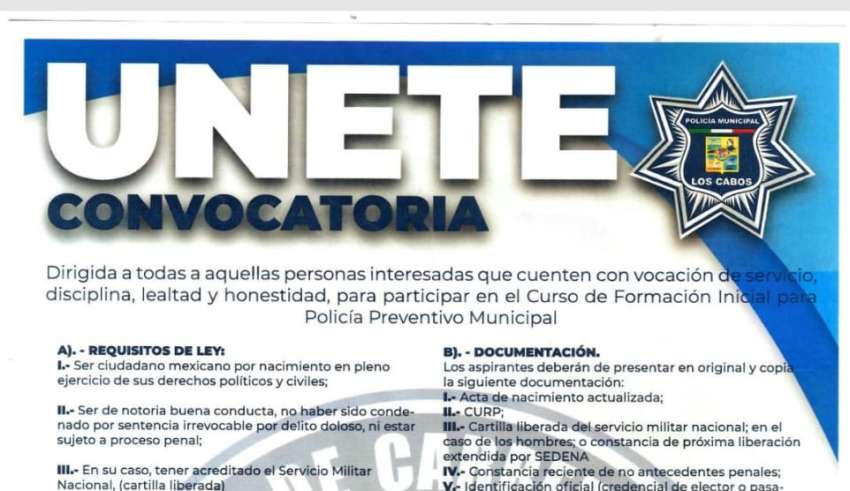 Los Cabos, B.C.S. 03 de febrero de 2024.- Con la finalidad de aumentar el estado de fuerza y mantener el orden, así como la seguridad en el municipio de Los Cabos, a través de la Dirección General de Seguridad Pública, Policía Preventiva y Tránsito Municipal, se invita a la ciudadanía a formar parte de la corporación policial como policía preventivo.