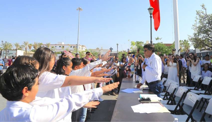 Los Cabos., B.C.S., 26 junio 2023.- La mañana de este lunes en la explanada del Palacio Municipal en San José del Cabo, el presidente municipal Oscar Leggs Castro tomó protesta al Cabildo Infantil integrado por niñas y niños que fueron elegidos a través de una votación el pasado mes de mayo, para representar a la comunidad infantil con propuestas en diversos temas que, desde su perspectiva, es importante atender de manera urgente.
