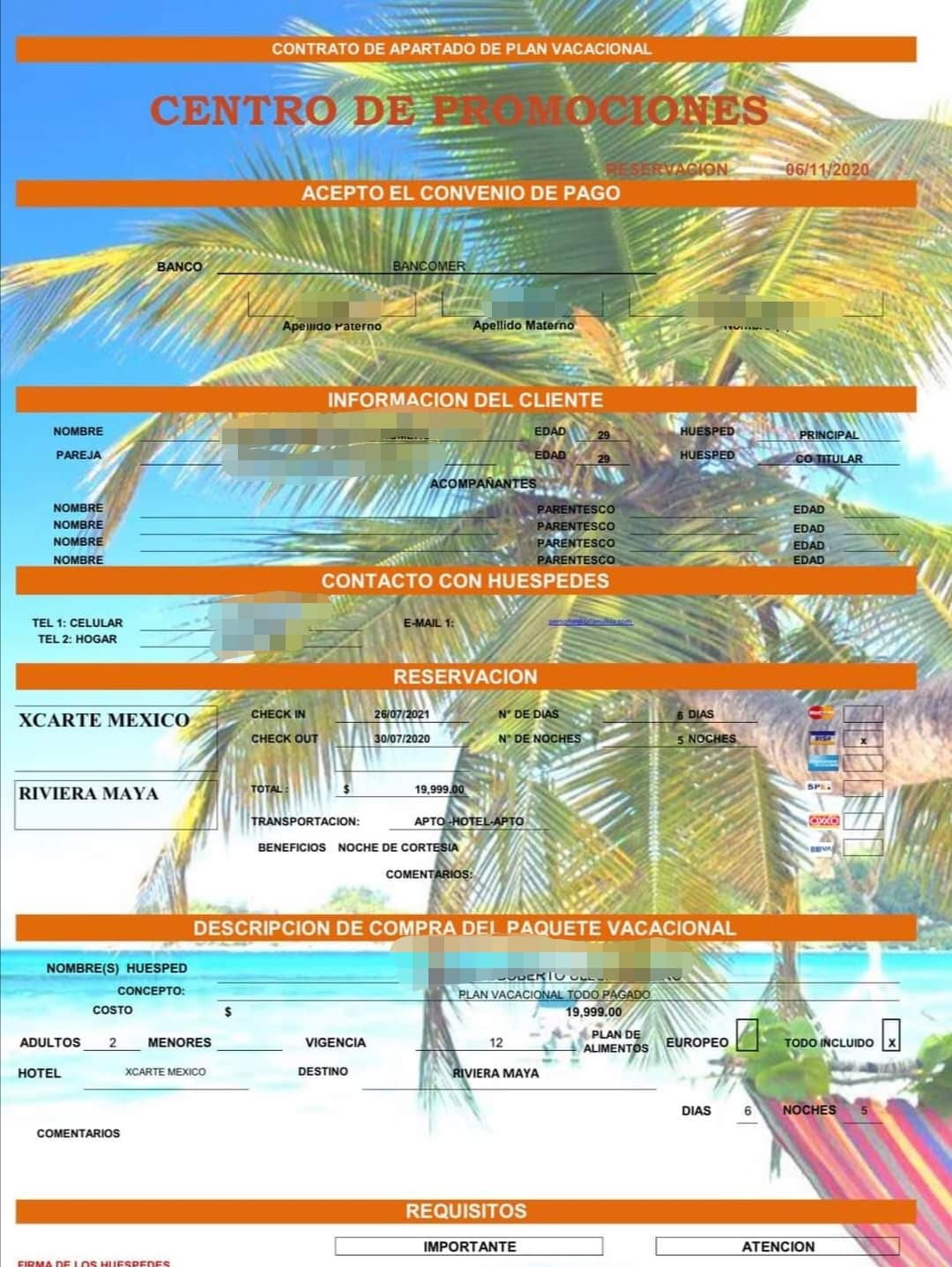 El plan consistía en un plan todo pagado, para dos personas en el hotel Xcaret México, por seis noches, cinco días. El cual sólo los hizo ilusionarse, pues los estafadores fueron tan hábiles que, al verlos dudar, hasta les facilitaron un supuesto registro de la SECTUR.