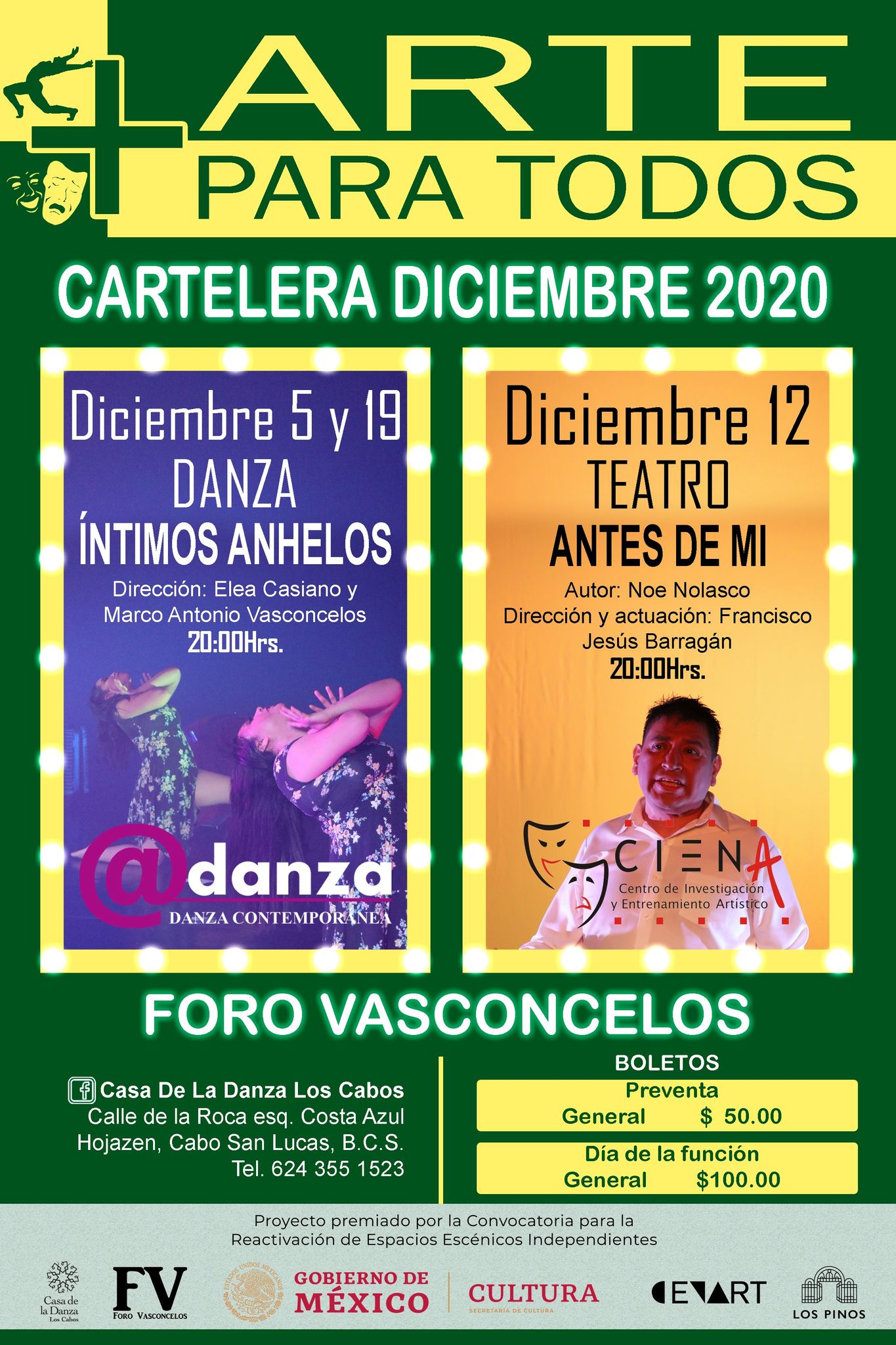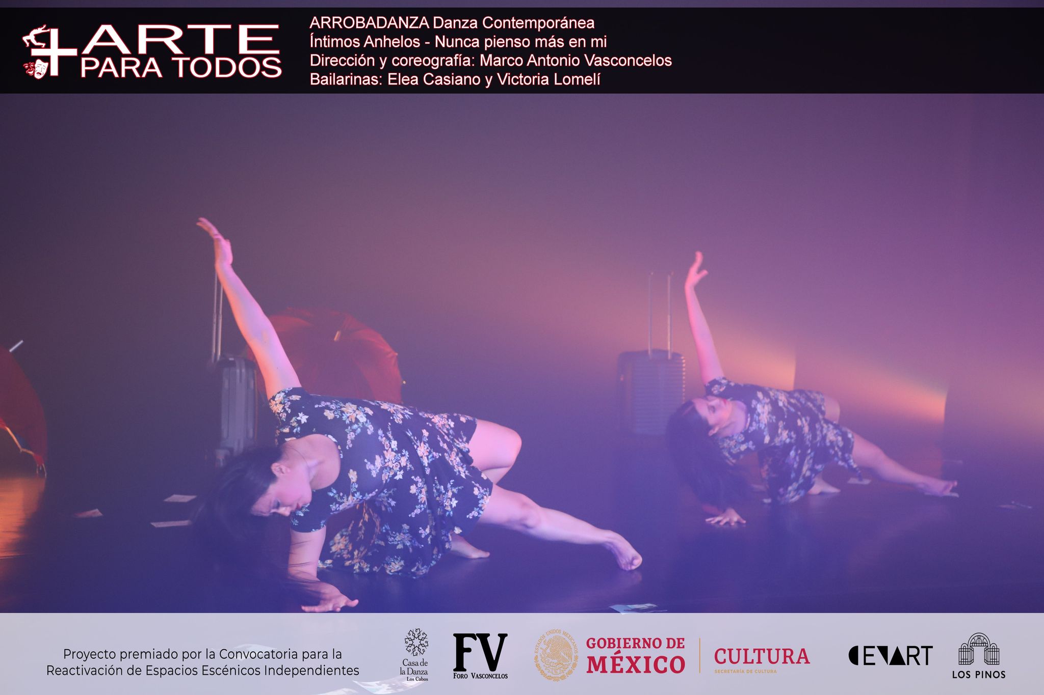 Así mismo el Foro Vasconcelos de Casa de la Danza abrió su cartelera a la ciudadanía de Los Cabos, con el grupo local ARROBADANZA – Danza Contemporánea, agrupación con una trayectoria de 22 años y pionera en la entidad, el cual cautivó y conmovió el pasado sábado 21 de noviembre de 2020 a su público, con el programa ÍNTIMOS ANHELOS, obras originales de los coreógrafos y directores Elea Casiano y Marco Antonio Vasconcelos, interpretadas por las bailarinas Elea Casiano y Victoria Lomelí.