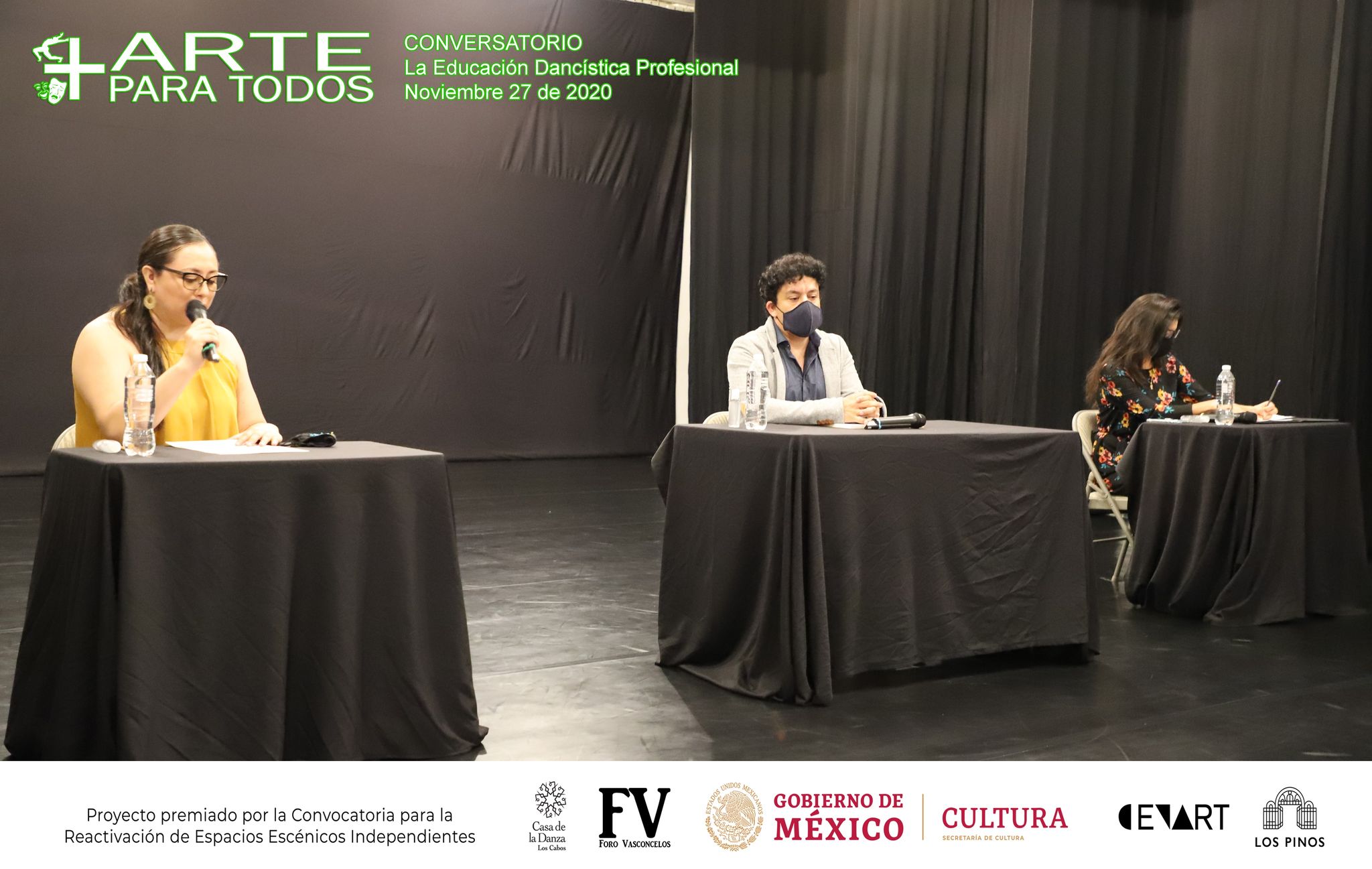 El proyecto MÁS ARTE PARA TODOS desarrolló el conversatorio de entrada libre “La educación Dancística Profesional” con las ponencias: “Los semilleros de danza”, “La educación no formal” y “La educación formal”; estas ponencias desarrolladas por los maestros Elea Casiano (danza contemporánea), Denisse López (danza folklórica) y Gamaliel Burgos (danza flamenca). Un conversatorio de reflexión y análisis entre alumnos y ponentes que dejan visiones establecidas para nuestro futuro dancístico en Los Cabos; dicho conversatorio se realizó el pasado viernes 27 de noviembre de 2020 en el Foro Vasconcelos de Casa de la Danza.