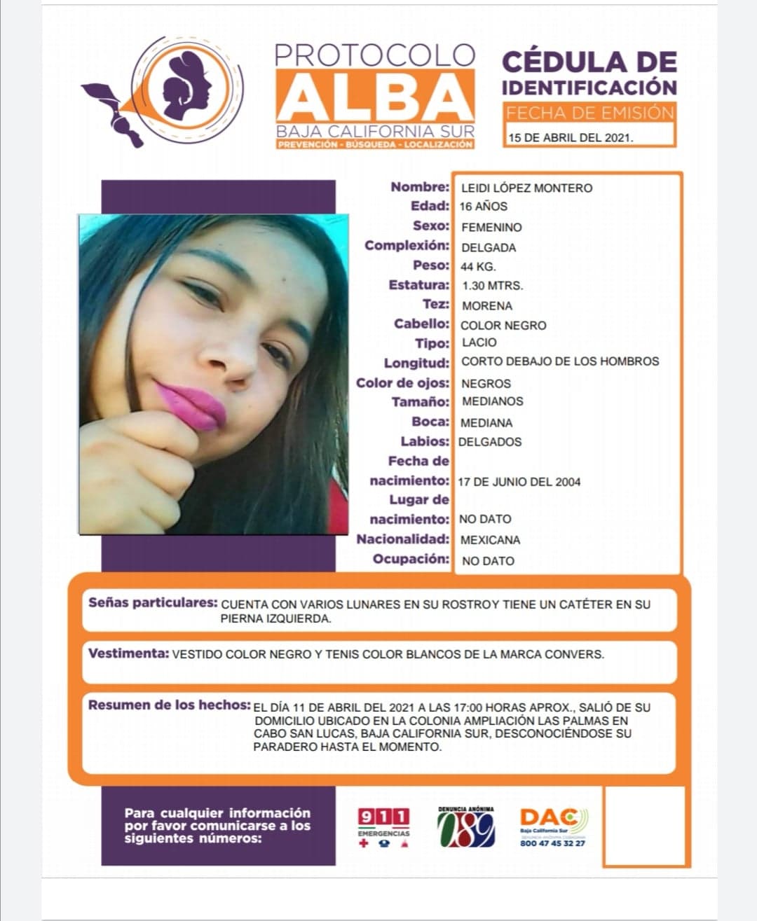 Los Cabos, Baja California Sur a 15 de abril del 2021.- La procuraduría General de Justicia del Estado de B.C.S., activó ficha de búsqueda y localización de Protocolo Alba de la menor Leidi López Montero, quien fue vista por última vez en Cabo San Lucas.