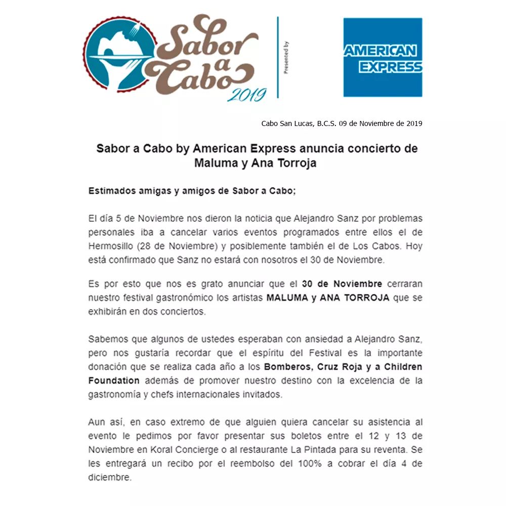 Los fans de Alejandro Sanz ya veían venir la posibilidad de que se cancelará también su concierto en Los Cabos, tras la noticia previa de su cancelación hace dos días en Hermosillo, donde tenía programado un concierto el 28 de este mismo mes.