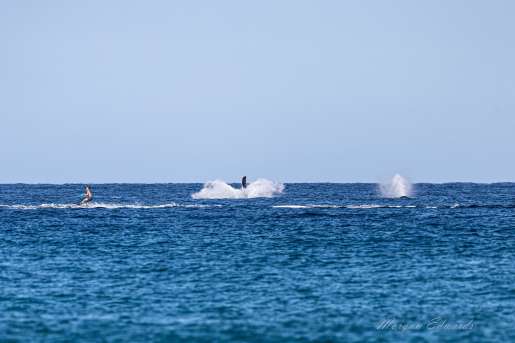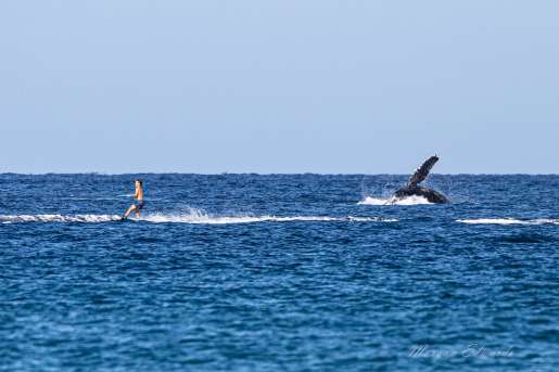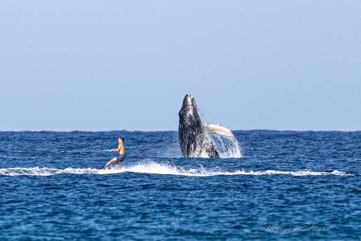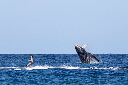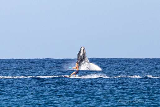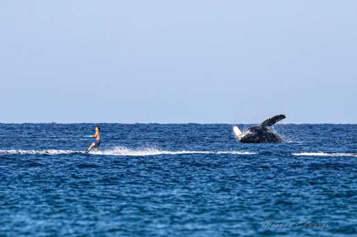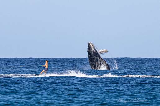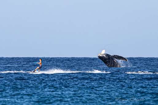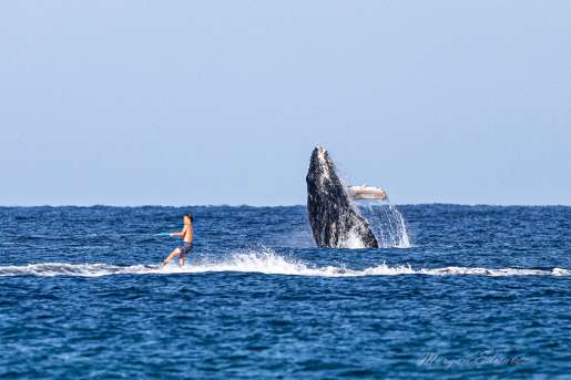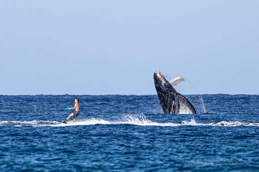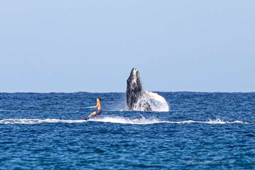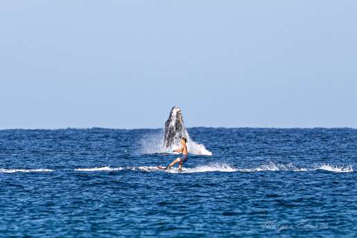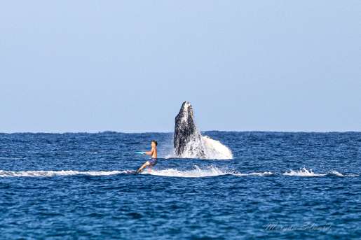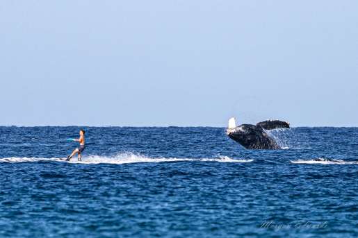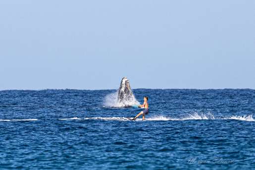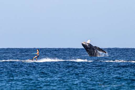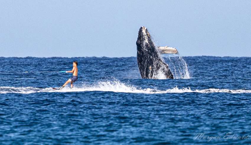 Los Cabos, Baja California Sur a 29 de marzo del 2023.- Gracias al lente fotográfico del extranjero Morgan Edwards, quedó inmortalizado el momento donde se ve a un menor niño sobre un esquí acuático y a escasos metros una ballena saltando.