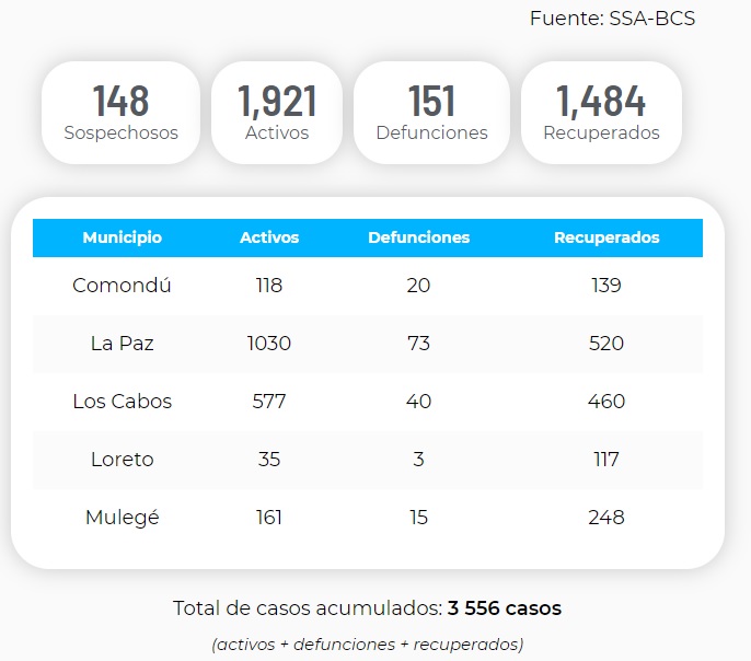 Los Cabos, es actualmente el segundo municipio del Estado con más contagios activos, el deshonroso primer lugar lo tiene la ciudad de La Paz, sumando 1,030 casos activos, lamentablemente 73 defunciones, y 520 recuperados. Entre los recuperados se encuentra el alcalde de La Paz, Rubén Gregorio Muñoz Álvarez.