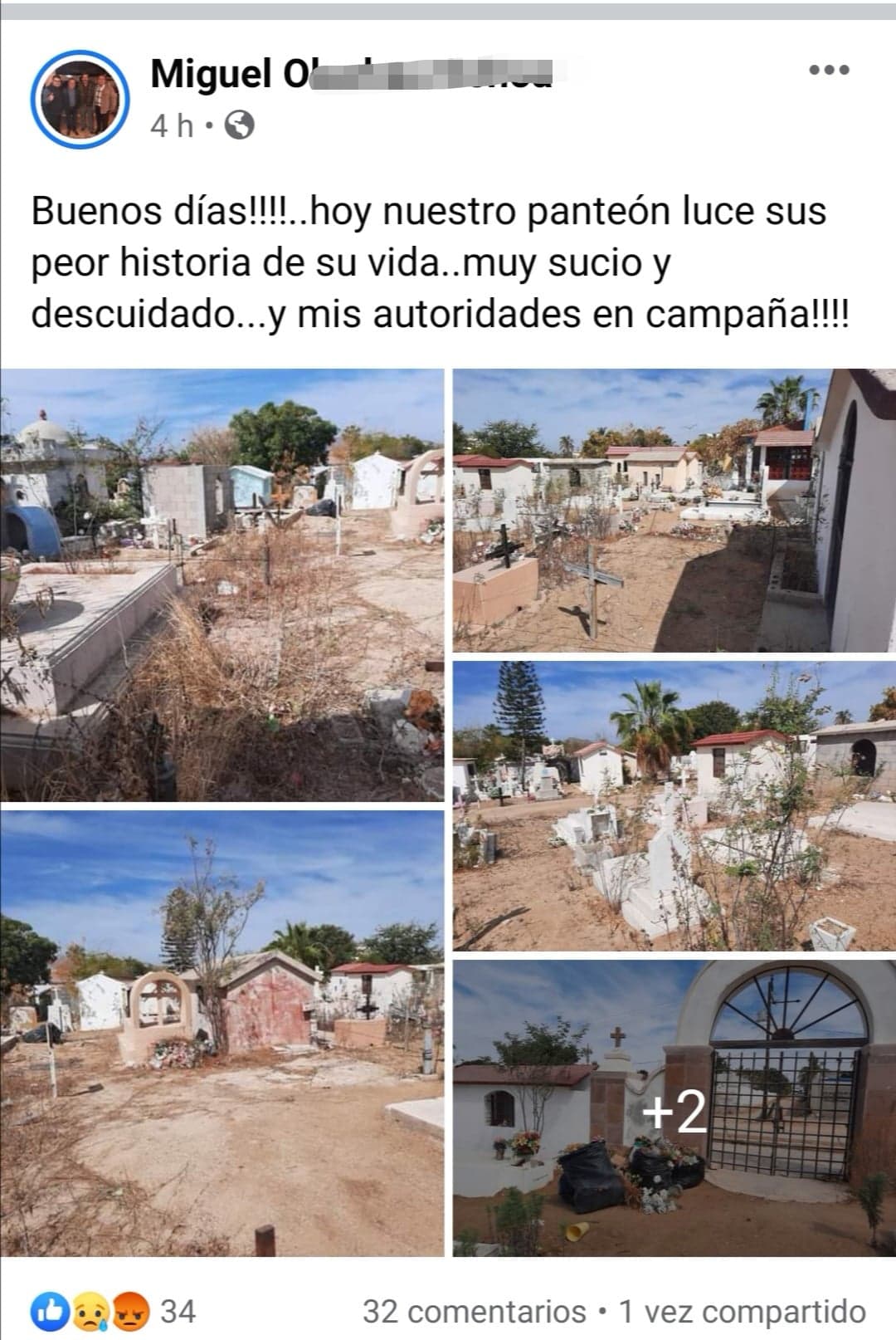 “Buenos días!!!, hoy nuestro panteón luce su peor historia de su vida, muy sucio y descuidado… y mis autoridades en campaña”, escribió el quejoso en sus redes sociales.