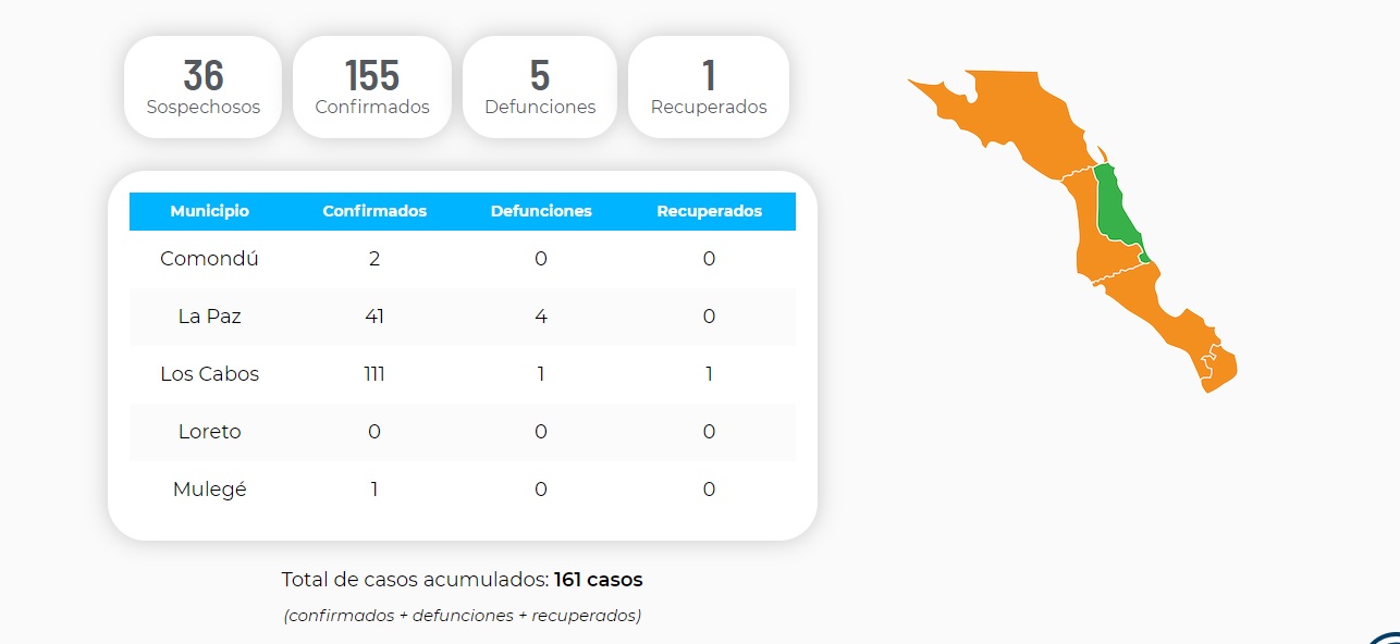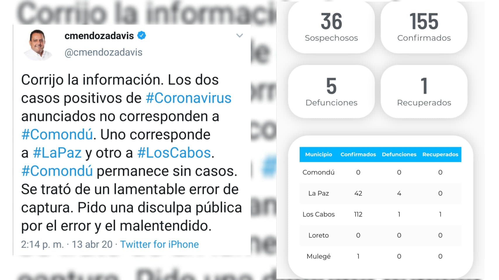 Después de este anuncio aclaratorio, las cifras quedaron de la siguiente manera, 42 casos positivos en La Paz, 112 en Los Cabos, y 1 en Mulege. 4 defunciones en La Paz, 1 en Los Cabos. Recuperados 1 en Los Cabos. el total de casos positivos en Baja California Sur asciende a 155.