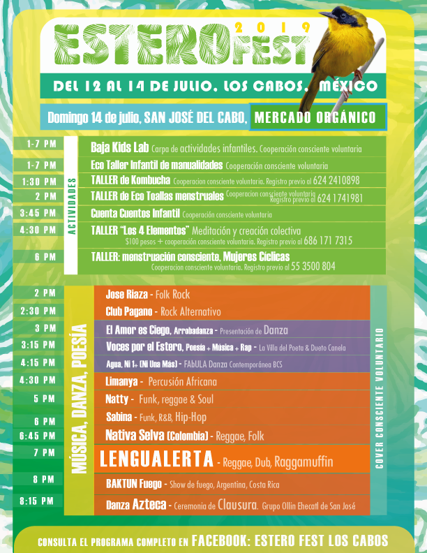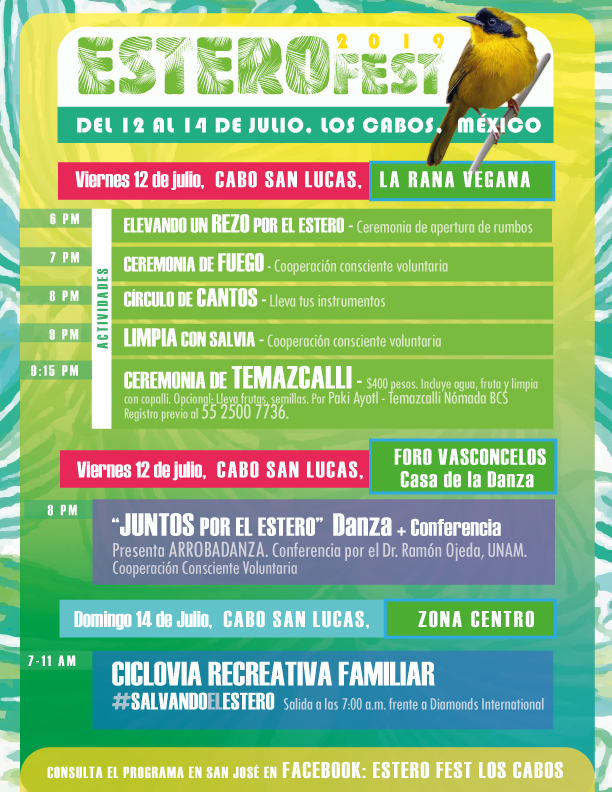 Los Cabos, B.C.S.- Los próximos 12, 13 y 14 de julio se estará realizando en 6 sedes de San José del Cabo y Cabo San Lucas el primer Estero Fest, un festival cultural con la finalidad de crear consciencia en la población sobre el impacto que tienen nuestras actividades y acciones en nuestro entorno y medio ambiente, al tiempo que creamos una re-valorización a nuestro estero josefino.