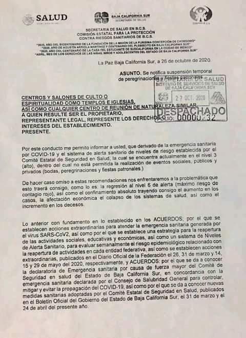 El boletín con fecha 26 de octubre del 2020 fue girado a todos los centros y salones de culto, de todo el estado de Baja California Sur, previo a las celebraciones del 12 de diciembre, día de la Virgen de Guadalupe, fecha en la que tradicionalmente se realizan peregrinaciones, participando un número importante de fieles y que en pandemia representan un alto riesgo de contagios por coronavirus.