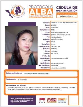 Los Cabos, Baja California Sur a 26 del 2023.- Autoridades activaron protocolo Alba de Baja California Sur, para pedir a la ciudadanía su ayuda para localizar a María de la Cruz Martínez Pantaleón de 26 años de edad y de ocupación Empleada doméstica.