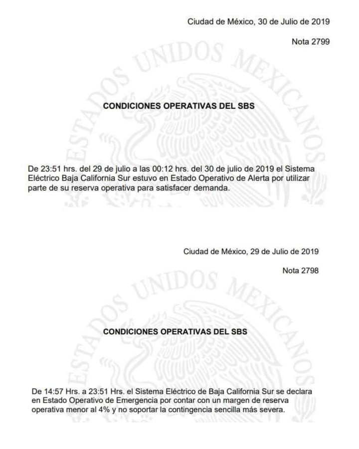 Su anunció más reciente fue que el sistema eléctrico en el estado sudcaliforniano estuvo en estado operativo de alerta por utilizar parte de su reserva operativa para satisfacer la demanda, de las 23:51 a las 00:12 horas.