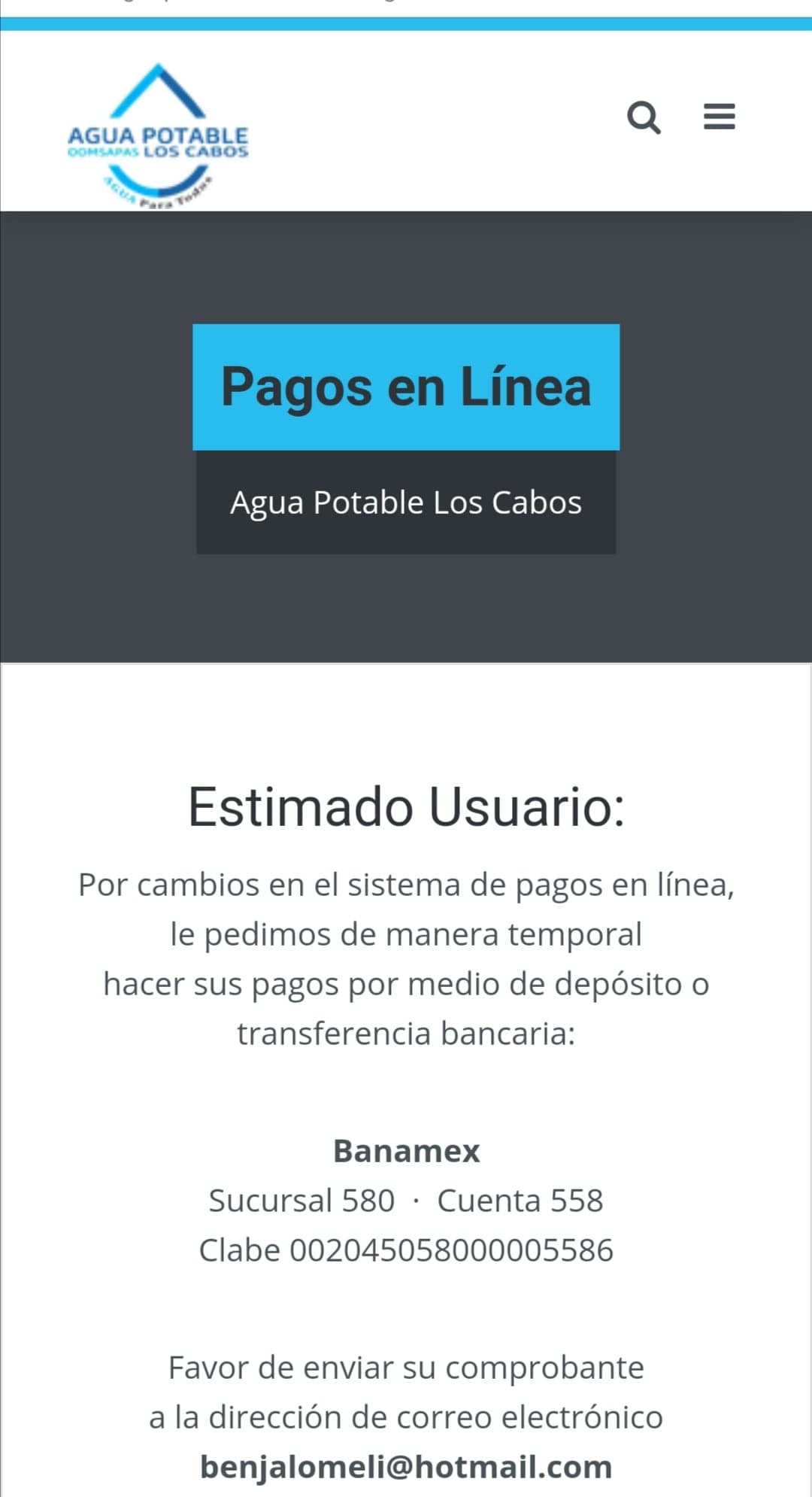 Sin embargo, según los usuarios iniciada la pandemia, el sistema comenzó a fallar, y lo que llamó más su atención fue que ahora en la página del agua potable invitan al usuario a pagar por depósito o trasferencia bancaria, a un número de cuenta, para luego enviar su comprobante a un correo electrónico personal. Situación que ha resultado incómoda para el usuario y se ha visto en la necesidad de tener que acudir a las instalaciones, pese a estar en pandemia.
