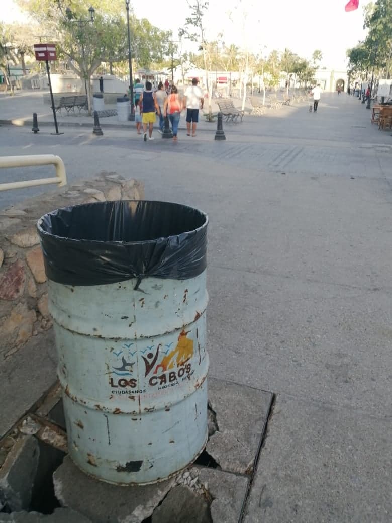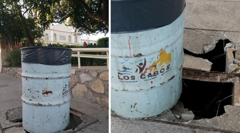 En las imágenes, el ciudadano captó como con un bote de basura del Ayuntamiento de Los Cabos se intenta tapar la falta de rehabilitación de los registros, en una zona completamente turística.