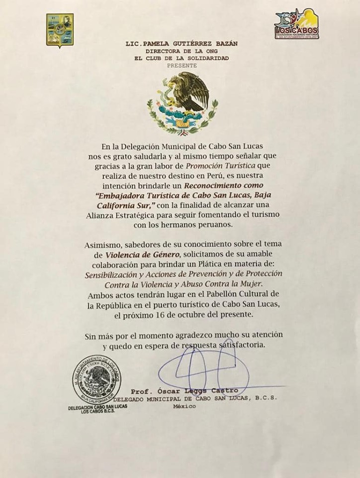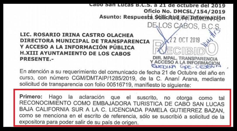 Debido a las inconsistencias, se solicitó vía transparencia municipal el curriculum de la señora Gutiérrez, pues además previo a su llegada circuló en redes sociales un documento firmado por el Delegado Leggs Castro donde se le invitaba a venir a esta delegación sanluqueña para recibir un reconocimiento como Embajadora Turística de Cabo San Lucas en el Perú, aclarando que dicho documento se suscribió a solicitud de la señora Gutiérrez únicamente para que pudiera salir de su país de origen, pero que finalmente a puerta cerrada recibió de manos del Delegado un reconocimiento por “su difusión”, más no como Embajadora Turística de C.S.L. en el Perú, como se dijo ella misma había solicitado.