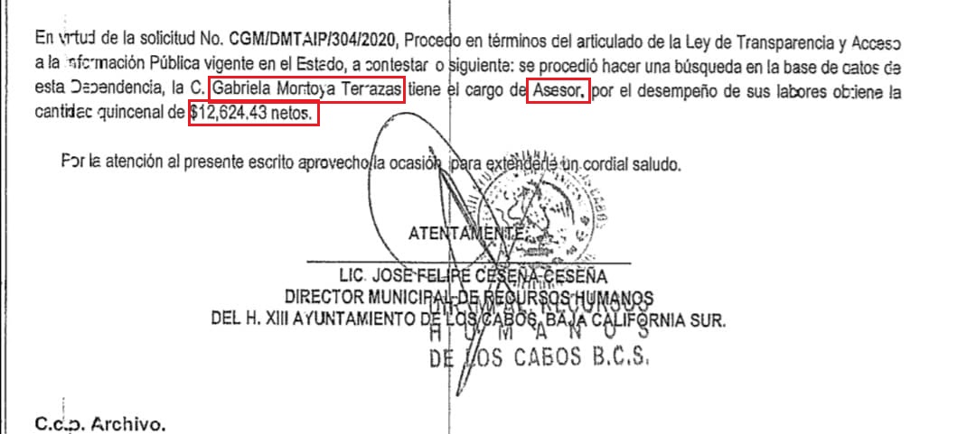 Los Cabos, B.C.S.- Luego de que de manera inesperada Gabriela Montoya fuera retirada del cargo de Coordinadora de Servicios Públicos en Cabo San Lucas, la hoy ex funcionaria pública sigue cobrando nómina quincenalmente, pero esta vez como “asesor”, dato corroborado a través de la Dirección de Transparencia Municipal. Pero, por otro lado, siendo empleada de la administración actual no ha dejado de operar políticamente entregando despensas a través de una asociación civil.