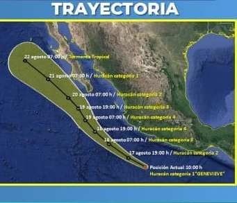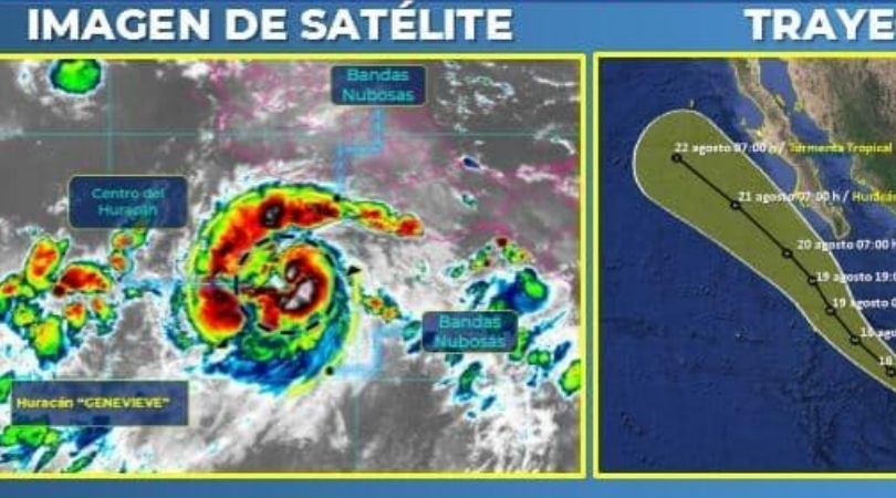 Los Cabos, B.C.S.- El Servicio Meteorológico Nacional de la Conagua, informó a las 9:00 horas de este lunes que la Tormenta Tropical Genevieve, que se encuentra en el Océano Pacífico se intensificóa Huracan categoría 1. Se localiza a 405 km al sur-suroeste de Zihuatanejo, Guerrero y a 415 km de Lázaro Cárdenas, Michoacán.