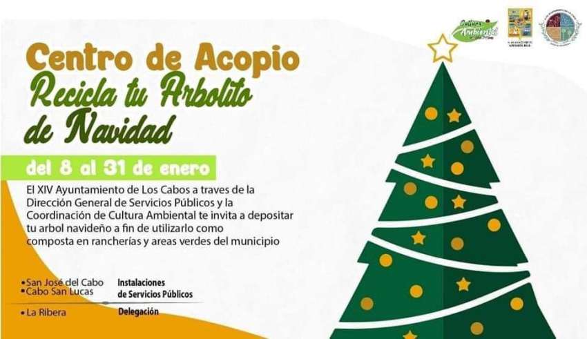 Los Cabos, B.C.S, 05 de enero, 2024.- Con el fin de evitar que los arbolitos navideños que adornaron los hogares cabeños por varios días durante la época decembrina terminen abandonados en las calles, la XIV Administración que encabeza Oscar Leggs Castro ha habilitado Centros de Acopio para reciclarlos.