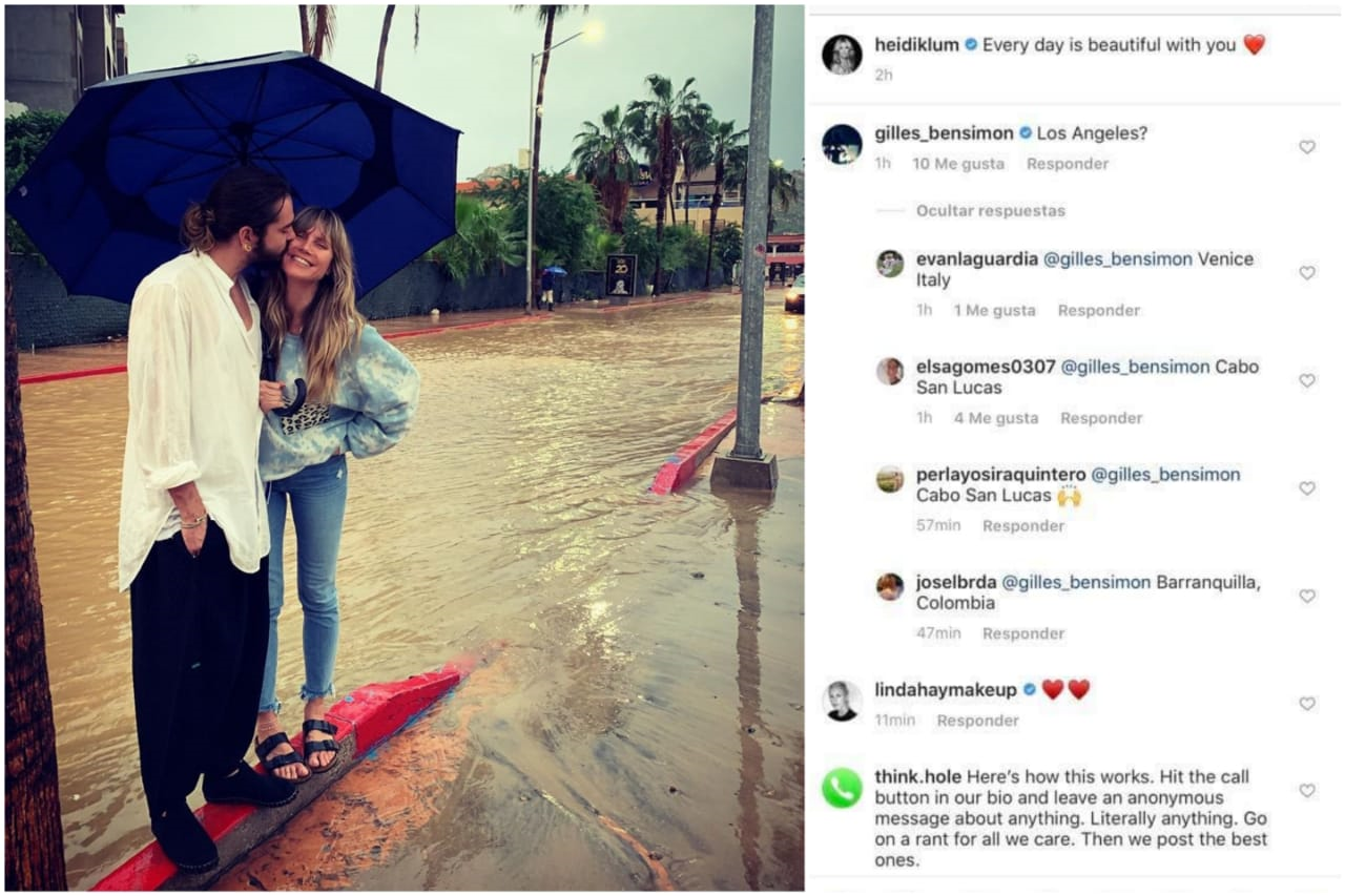 La imagen fue colocada ayer por la tarde, durante las lluvias que se dejaron sentir en Los Cabos, donde todo indica que a la famosa modelo no le importó las inundaciones, pues se le ve sonriendo a lado de su esposo el músico Tom Kaulitz, famoso miembro de la banda Tokio Hotel, bajo una sombrilla azul marino y recibiendo un beso en la mejilla de su amado.
