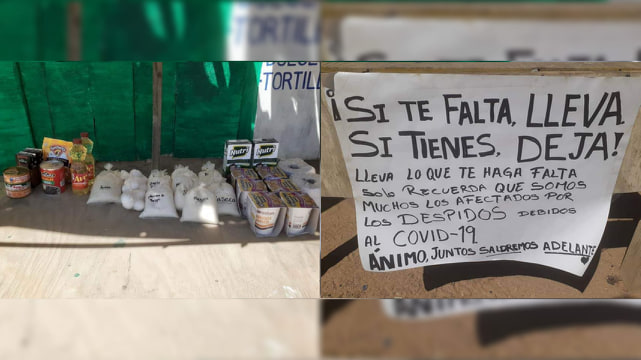 “No es mucho, pero con lo poco que pueda apoyaré” señaló la señora, quien junto a los productos básicos colocó una cartulina con la leyenda “»Si te falta LLEVA, si tienes DEJA. Lleva lo que te haga falta solo recuerda que somos muchos los afectados por los despidos debido el COVID-19. Ánimo, juntos saldremos adelante”.