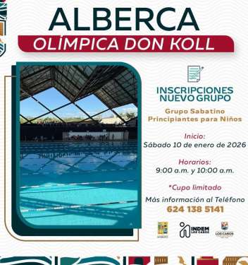 Los Cabos, Baja California Sur.– Informa el Instituto del Deporte Municipal de Los Cabos la apertura de un nuevo grupo sabatino de natación dirigido a la niñez en nivel principiantes, el cual se impartirá en la Alberca Olímpica Don Koll, en Cabo San Lucas.