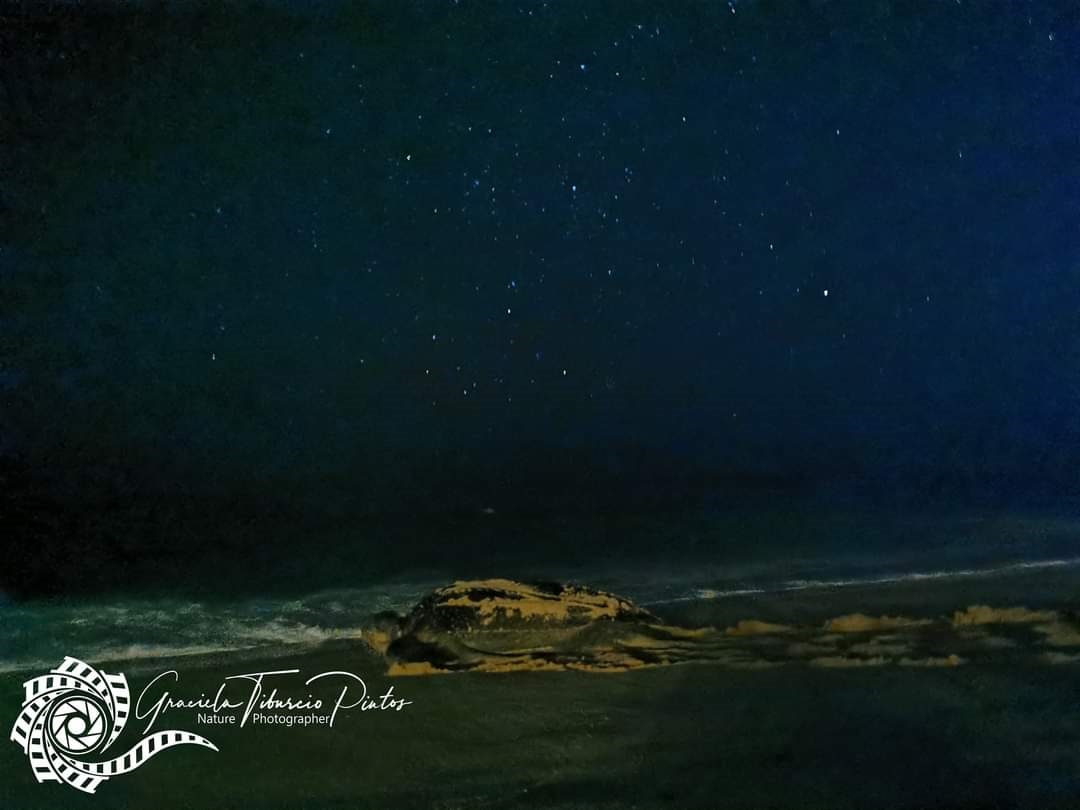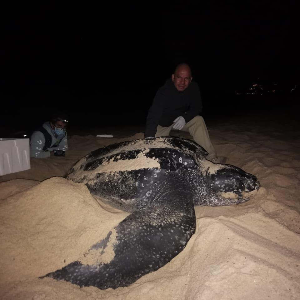 Los Cabos, Baja California Sur a 11 de enero del 2021.- Al rededor de las 11 de la noche del día 10 de enero, en medio de una boda y ante el asombro de propios y extraños, una tortuga Laúd de un peso aproximado de media tonelada, salió a la playa frente al desarrollo Villas del Mar a desovar un total de 67 huevos, los cuales fueron protegidos. Se trata de la misma tortuga que salió a desovar a finales de diciembre en el hotel Ventanas.