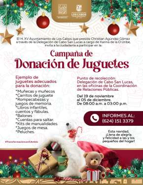 Los Cabos, Baja California Sur.– Con la finalidad de llevar alegría a niñas y niños durante la próxima temporada decembrina, la Delegación de Cabo San Lucas, encabezada por Karina de la O Uribe, convoca a la ciudadanía a sumarse a la Campaña de Donación de Juguetes 2025, dirigida a fortalecer el espíritu solidario de la comunidad y beneficiar a menores de distintas zonas del municipio.