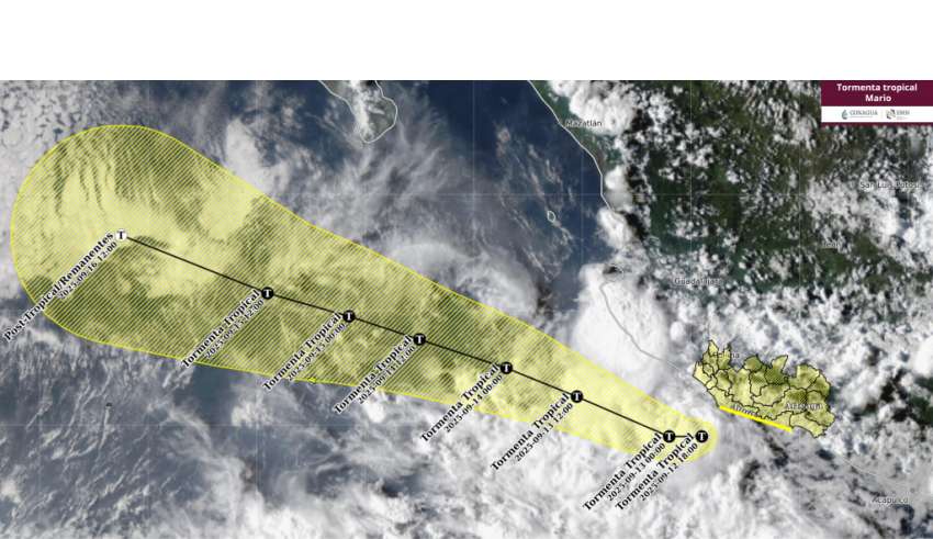 Los Cabos, Baja California Sur.- La tormenta tropical Mario se desplaza rápidamente frente a las costas de Michoacán y Colima, con rumbo hacia el Oeste-noroeste a 26 km/h. Se localiza a 145 km al sur-sureste de Manzanillo y a 170 km al oeste de Lázaro Cárdenas, Michoacán; esta posición indica proximidad a zonas costeras del Pacífico mexicano y posibles impactos en el occidente del país, así lo informa la Dirección Municipal de Protección Civil de Los Cabos.