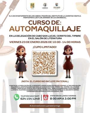 Los Cabos, Baja California Sur.– El XV Ayuntamiento de Los Cabos, a través del Instituto de la Juventud (INJUVE), lanzó la convocatoria para participar en el Curso Intensivo de Automaquillaje de Día, dirigido a jóvenes de entre 12 y 29 años de edad.