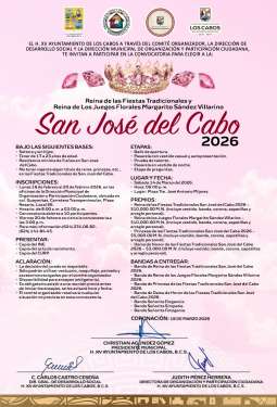 Los Cabos, Baja California Sur.– Quedo abierta la convocatoria para elegir a la reina de las Fiestas Tradicionales San José del Cabo 2026 y reina de los Juegos Florales “Margarito Sández Villarino”. La invitación va dirigida a jóvenes mujeres solteras, sin hijos, de entre 17 y 23 años de edad, con residencia mínima de cinco años en San José del Cabo.