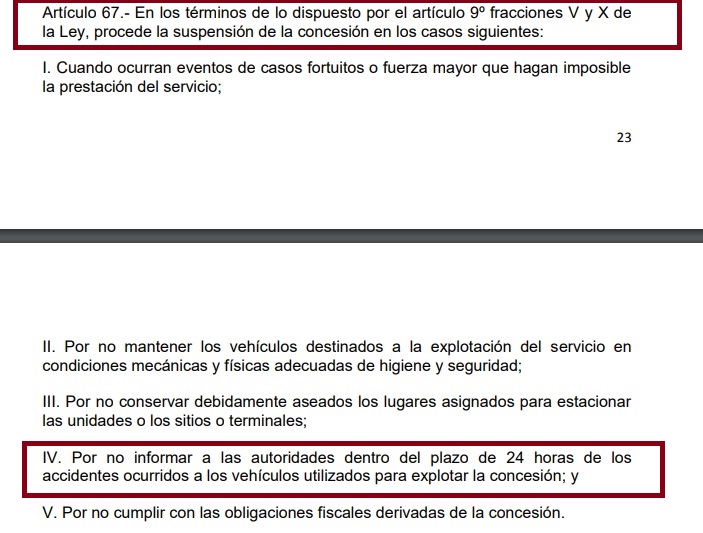 El Reglamento vigente de la Ley de Transporte para el Estado de Baja California Sur, es claro y preciso, pues en el Artículo 67 especifica que una de las causas para proceder en la suspensión de la concesión son: por no informar a las autoridades dentro del plazo de 24 horas de los accidentes ocurridos a los vehículos utilizados para explotar la concesión.