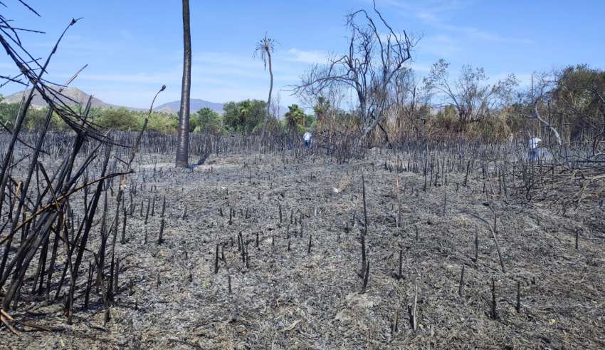 Los Cabos, Baja California Sur a 19 de abril del 2023.- Posterior de sofocado el incendio que arrasó con más de cinco hectáreas de palmar y plantas de bambú en las inmediaciones de la avenida Centenario en el Centro Histórico de San José del Cabo, lo que provocó la movilización de Bomberos, Protección Civil, Seguridad Pública, al hacer el barrido de rastreo las autoridades encontraron el cuerpo calcinado de una persona .