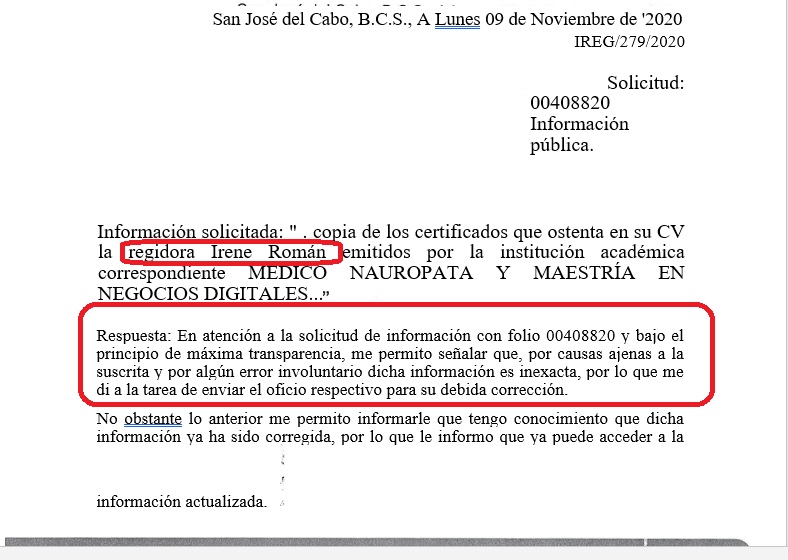 Dada la inconsistencia, un ciudadano solicitó vía Transparencia Los Cabos, copia de los certificados de dichos estudios médicos y maestría, en la que la regidora Irene Román Salgado dio contestación señalando que por causas ajenas a su suscrita y por algún error involuntario dicha información es inexacta, es decir que no existe y que no puede comprobar dicho cirruculum que desde el 2018 y a la fecha sigue vigente en la plataforma de Transparencia Los Cabos.