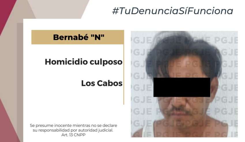 Los Cabos, Baja California Sur a 15 de abril del 2023.- La Procuraduría General de Justicia del Estado (PGJE), por medio de la Unidad Especializada en Atención de Personas Detenidas en Cabo San Lucas, logró que un Juez de Control dictara Auto de Vinculación a Proceso contra de Bernabé “N”, probable responsable de homicidio culposo con motivo de tránsito vehicular.