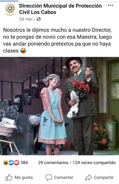 Fue alrededor de las 9:30 de la mañana, cuando en la página de Facebook oficial de Protección Civil Los Cabos se volvió viral, pero no por su importante información, sino porque se publicó un post haciendo alusión a que la suspensión de clases era sólo pretextos, situación que causó gracia entre algunos internautas y molestia entre otros.