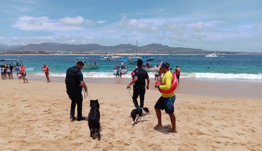 Los Cabos, Baja California Sur a 13 de agosto del 2022.- Luego de que se reportara en redes sociales, que se encontraban dos perros solos en la playa conocida como “Playa del Amor” en la zona del Arco de Cabo San Lucas, elementos de la policía turística fueron a rescatarlos.