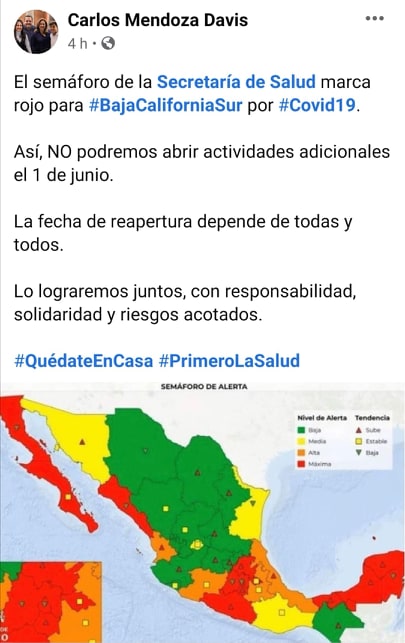 Los Cabos, B.C.S.- La actividad turística en Los Cabos que se había anunciado se reactivaría el próximo 01 de junio, ha sido cancelada de momento, tras el anuncio del Gobernador del Estado, Carlos Mendoza Davis quien informó este miércoles 13 de mayo que el semáforo de la Secretaría de Salud marca rojo para Baja California Sur por Covid19.