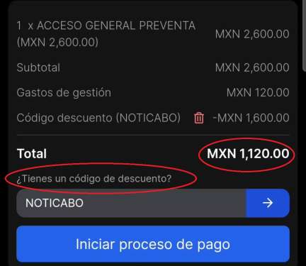 Pensando en nuestros lectores, hemos conseguido un código de descuento para nuestros fieles seguidores. Lo único que tienen que hacer es entrar al sitio web oficial: https://full-pass.mx/xantusii#events/EDNO, seguir las instrucciones de compra de manera habitual, completar datos de nombre y correo electrónico y abajo del desglose total del cobro dar click donde dice ¿Tienes un código de descuento?, donde deberán escribir el código: NOTICABO (en letras mayúsculas).