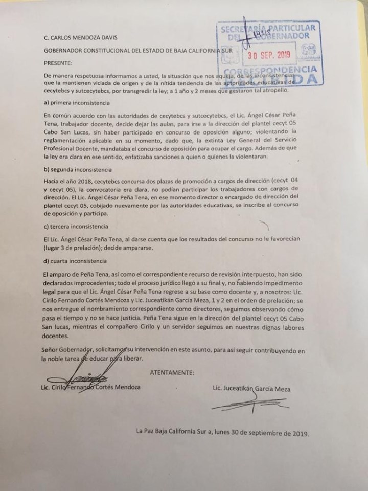 La información salió ventilada a través de un escrito dirigido al Gobernador del Estado, Carlos Mendoza Davis, firmado por los maestros: Lic. Cirilo Fernando Cortés Mendoza y Lic. Juceatikán García Meza, así como entregado y recibido en la Secretaría Particular del Gobernador, a quien indican como a lo largo de más de un año dos meses se ha transgredido la ley, por parte de las autoridades educativas de Cecytebcs y sutcecytebcs.