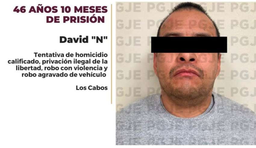 Los Cabos, BCS a 13 de marzo del 2024.- La Procuraduría General de Justicia del Estado (PGJE) BCS, logró que se impusiera una pena de 46 años 10 meses de prisión a David N, de apodo “El chilango”, quien resultó responsable de los delitos de homicidio calificado en grado de tentativa, privación ilegal de la libertad, robo con violencia y robo agravado de vehículo de motor.