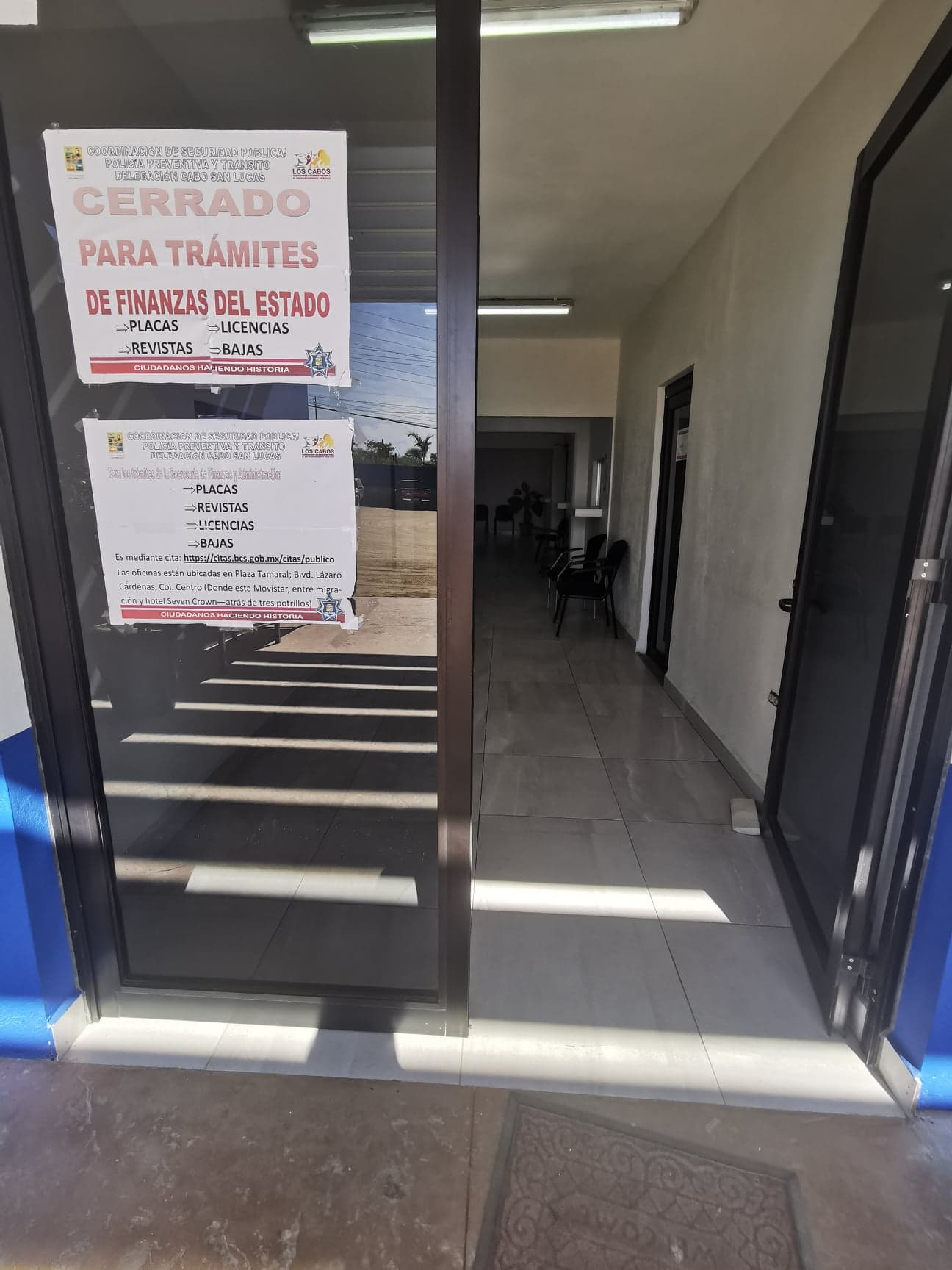 Una situación similar se vivió en el módulo de tránsito que se ubica a un costado del auditorio municipal de Cabo San Lucas, donde ya pagada su multa llegó para recoger su placa, observando que ahí si había con bote de gel antibacterial en la puerta de acceso, pero de dudosa procedencia, pues se trataba de un vaso con chupón lleno de mugre que había sido rellanado y una agente atendiendo de igual manera sin uso de cubrebocas.