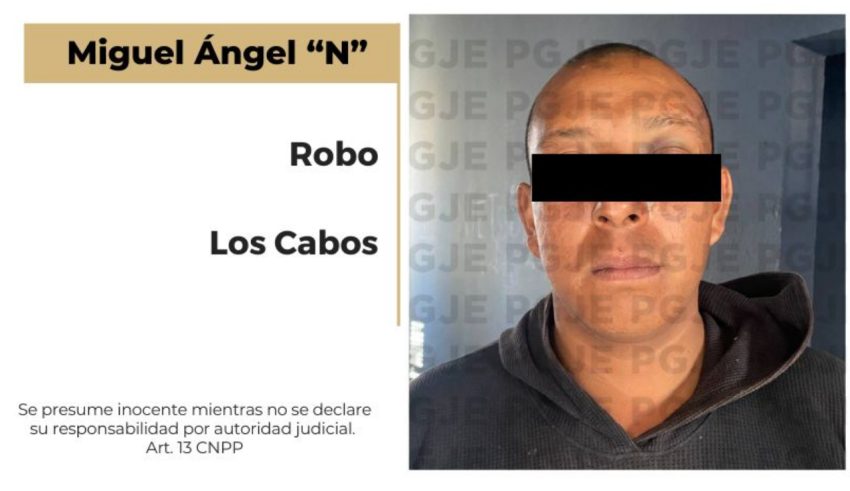 Los Cabos, BCS a 27 de noviembre del 2023.- La Procuraduría General de Justicia del Estado (PGJE) de Baja California Sur, obtuvo vinculación a proceso penal en contra de Miguel Ángel “N”, acusado de robo cometido de noche, hechos ocurridos en Cabo San Lucas el sábado 18 del mes en curso.