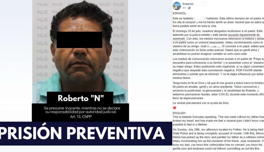 Al respecto su hija Isabella, escribió a través del Facebook de su padre, que su padre está siendo acusado injustamente de asesino y que los medios mexicanos pintan a su padre como un criminal despiadado, incriminándolo como el asesino de su amigo, José.