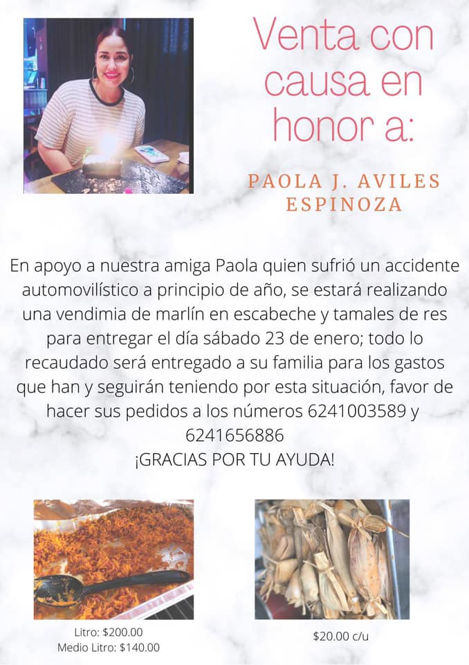Los Cabos, Baja California Sur a 21 de enero del 2021.- Debido a la gravedad de las lesiones que sufrió la cabeña Paola J. Avilés, en un aparatoso accidente automovilístico iniciando el año 2021, sus amigas han organizado una vendimia gastronómica para ayudar a la familia con los gastos hospitalarios.